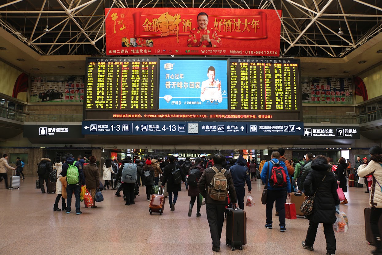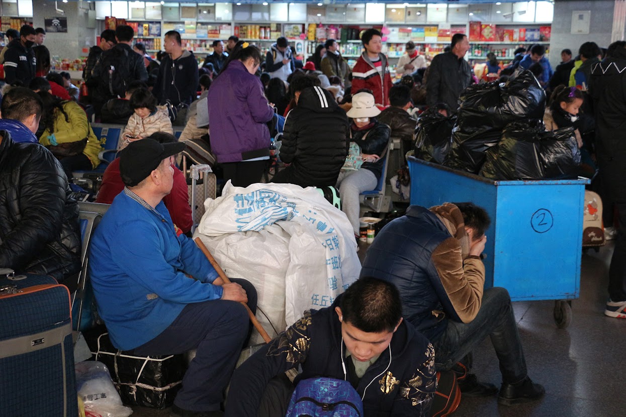 Num país tão vasto, as viagens são habitualmente longas e demoradas. Se nos comboios rápidos o tratamento é equivalente ao de um avião, nos comboios mais lentos o cenário muda radicalmente. Nestes comboios, as pessoas acomodam-se como podem. Parecem felizes, conversando por vezes animadamente com quem está ao lado. O movimento nos corredores é, porém, ininterrupto. Periodicamente circulam carrinhos com comida e diversos objetos de entretenimento para venda. Há quem compre um presente para roubar um sorriso à criançada. No entanto, quando a fome aperta, o caos instala-se. Os mais precavidos trazem grandes farnéis e é normal as pessoas comerem, por exemplo, um pernil de porco ou uma taça de noodles no interior das carruagens. O lixo amontoa-se por todo lado. Porém, ninguém parece incomodado!