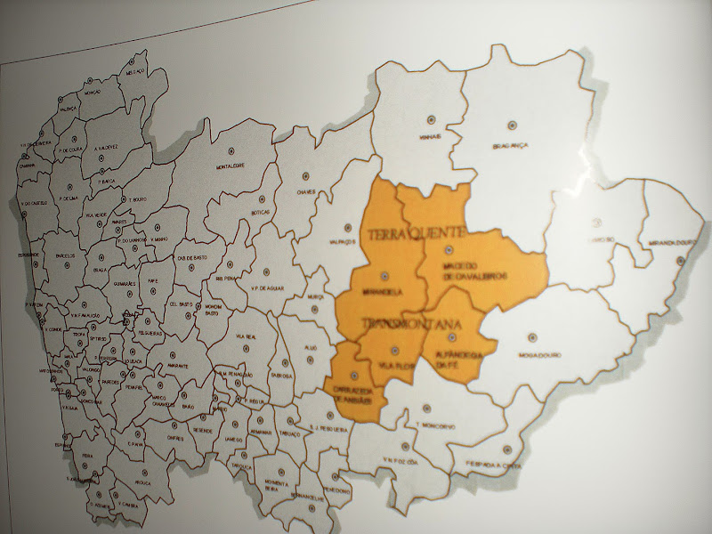 Decidimos entrar. No interior, esperava-nos uma surpresa: um conjunto de painéis de azulejos “Os Anjos da Montanha” de Graça Morais e, nos escaparates de entrada, vários livros sobre a artista. Deu-me nas vistas uma capa com uma pintura conhecida. Abri-o, li aqui e ali passagens do texto introdutório da autoria de António Carlos Carvalho, entrecortado por belíssimas fotos de Roberto Santandreu e revi pinturas e desenhos de Graça Morais. Achei-o interessante no seu todo e, por isso, resolvi comprá-lo para oferecer mais tarde à nossa amiga como recordação. Já no carro, voltei a abri-lo e, numa das primeiras páginas, reparei num mapa do norte de Portugal, assinalada a amarelo-torrado, a região Terra Quente Transmontana, no nordeste transmontano que abarca cinco municípios: Carrazeda de Ansiães, Vila Flor, Alfândega da Fé, Mirandela e Macedo de Cavaleiros.